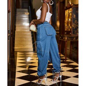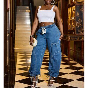 Features: Super baggy fit with a high waist and wide barrel legs, these jeans give off that Y2K and streetwear edge. The elastic drawstring waistband makes for an easy, comfy fit, and the six functional pockets add a fun, practical detail. Perfect for a relaxed, modern look that pairs well with simple tops, crop tops, jackets, or sneakers.
