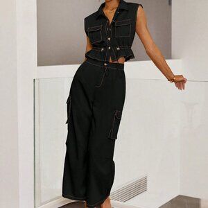 Women's Pocket Drawstring Waist Sleeveless Top And Casual Pants Set