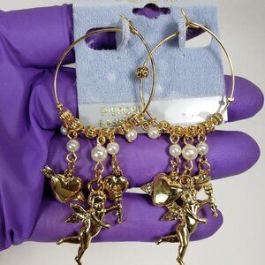women's fashion, polished, gold tone, beaded hoop, drop earrings, dangling charms, heart, angel, love, charming, unique, versatile, casual, formal