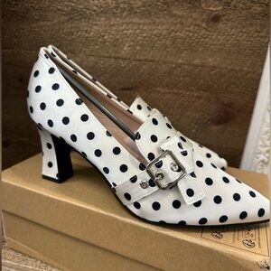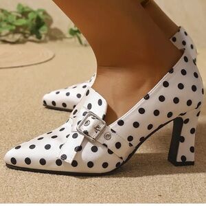 Step into retro chic with these white satin-look pumps featuring bold black polka dots, a pointed toe, and a decorative buckle strap. The chunky block heel offers both style and stability, perfect for pairing with dresses, skirts, or tailored pants.