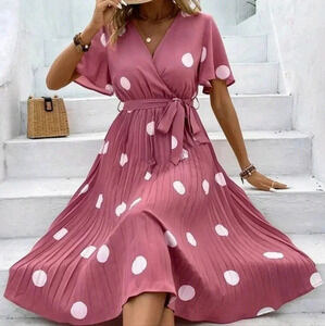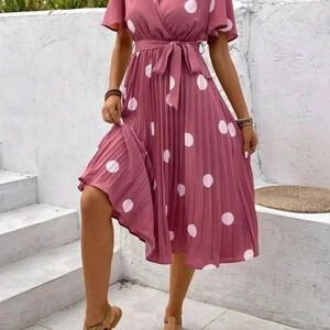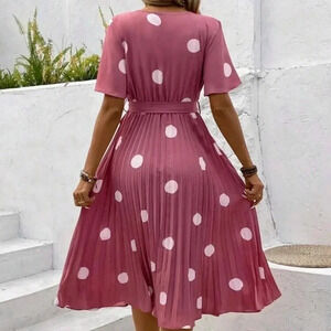 Women's Polka Dot Print Pleated HemBelted Dress