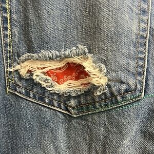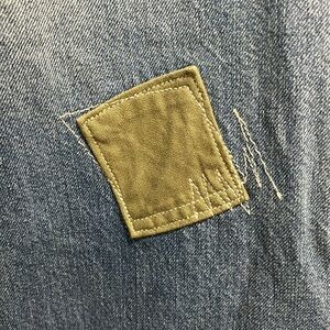 Shadow of a patch at the back. Rips, repairs, and patches throughout.