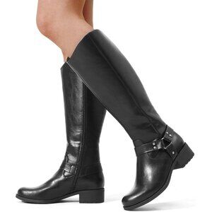 Women's Polyurethane Black Buckle Side Zipper Squared Toe Knee High Riding Boots