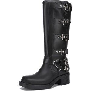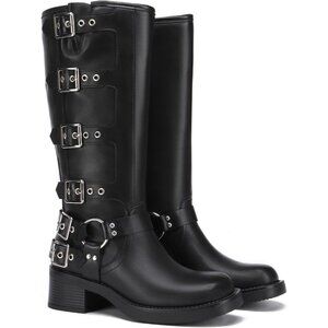 Women's Polyurethane Black Buckle Squared Toe Knee High Riding Motorcycle Boots