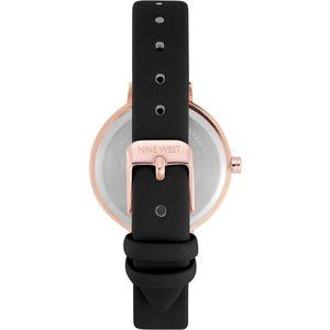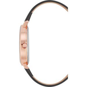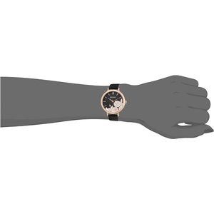 Glossy black dial with floral design; rose gold-tone hands and markers