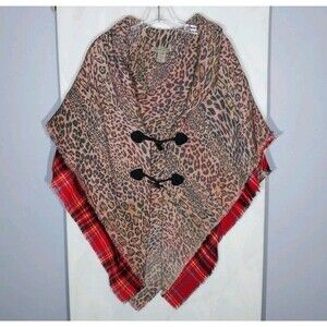 This women's poncho by Sharon Young is a one size animal print plaid Lagenlook boho hippie flowy and comfortable outerwear piece. Made from 100% acrylic, this long poncho features a toggle closure and fringe accents, perfect for casual occasions. The multicolor pattern and hippie, bohemian theme make it a stylish choice for fall, winter, or spring. The layered and asymmetric design adds a unique touch to this cozy and trendy piece for women looking for a statement jacket.