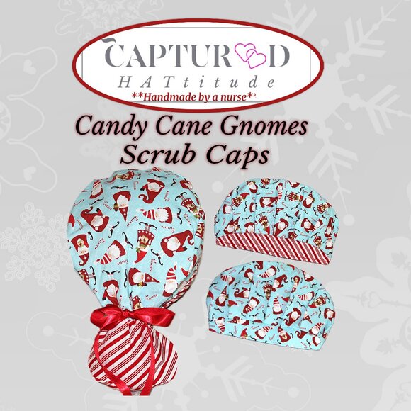 Womens Ponytail Scrub Cap Christmas Candy Cane Gnomes *Handmade