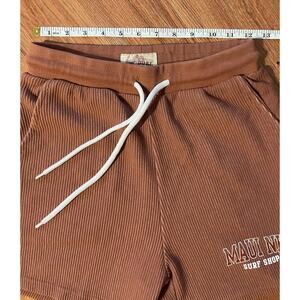 Women’s brown drawstring shorts by Pop Surf featuring Maui Nix logo. Tagged size S – see pics for exact measurements. Soft cotton/poly blend with a cozy, midweight feel. Made in Pakistan. No visible stains or holes. Please see photos for fabric texture, waistband, and logo detail. Perfect for “coastal lounge,” “surf shop casual,” or “off-duty beachwear” styling.