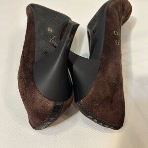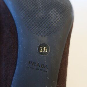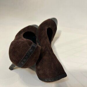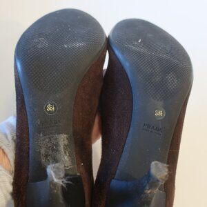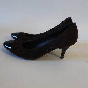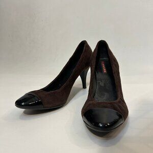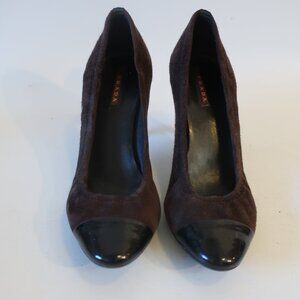Womens Prada Brown Black Suede Patent Leather Capped Toe Heels Pumps 38.5 US/8.5