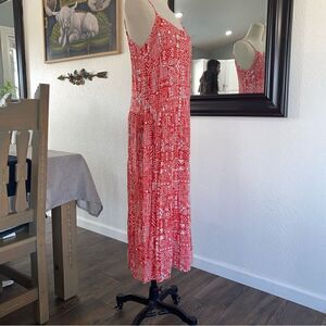 A beautiful maxi dress in a size medium. It has a printed pattern in bold colors that looks great with any accessory. The neckline is scooped and the sleeves are adjustable spaghetti strap, making it perfect for a summer day. The length of the dress falls just below the knee, giving you a stylish and comfortable look. Add a pair of sandals and some statement jewelry to complete the look.