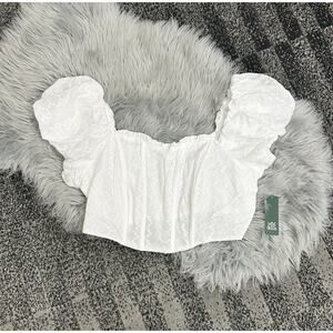 Elevate your wardrobe with this stylish Wild Fable corset top. The eyelet detailing and short balloon sleeves add a touch of elegance to this cropped blouse. Available in size XXL, this plus-size top is perfect for women who want to make a fashion statement. The white color complements any outfit and makes it perfect for any occasion. Ideal for those who love to stay on-trend, this top is a must-have in your closet.
