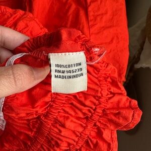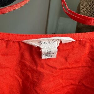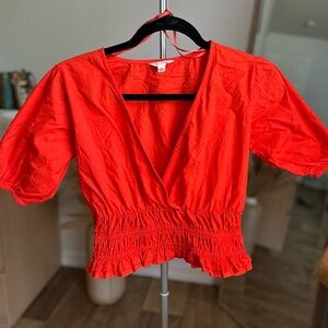 Vibrant red/orange blouse with short sleeves and a V neck line.