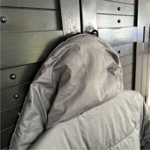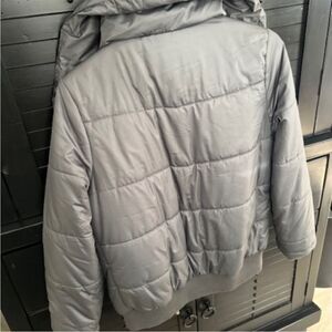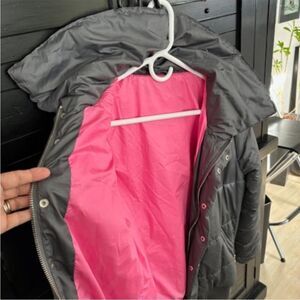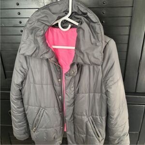 Women's puffer, size M, grey with pink lining and oversized collar, 2 zipper pocket and overlapping fabric with snap buttons for solid closing of front zipper