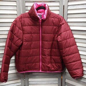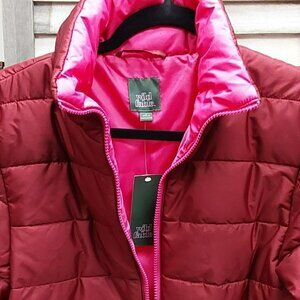 Puffer jacket from Wild Fable with a channel-stitched quilted construction. Made from soft fabric in a solid color with a contrasting-color taffeta lining and matching trimmed edges. Tailored in a casual fit that hits at the waist. Features a full-length zippered front that can be pulled up to create a high neck or down to create a collar. Two waist pockets complete the design with functional flair.