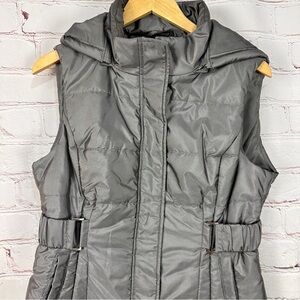 Womens Puffer Vest size Medium grey Sleeveless Hooded Fitted Zip Snap Outerwear