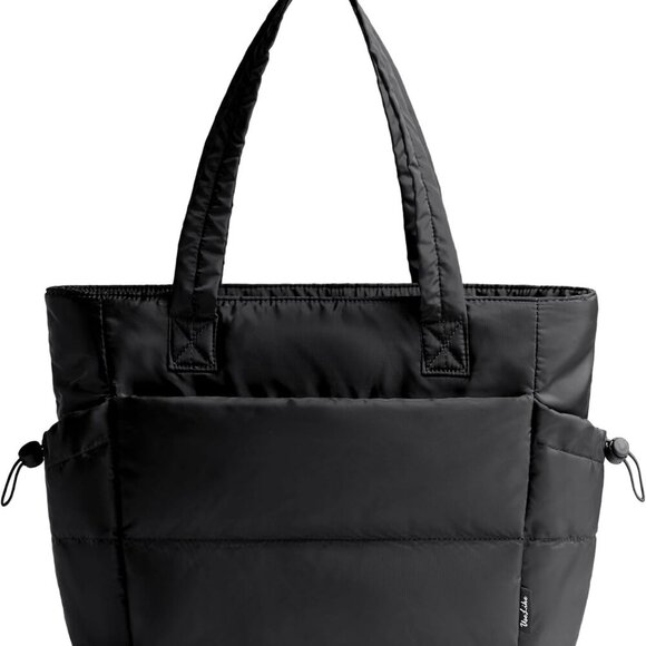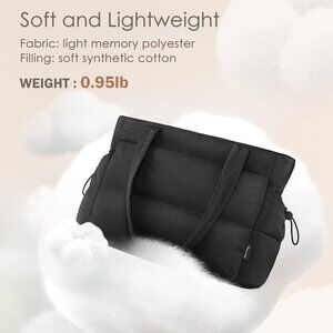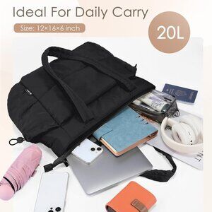Features: Trendy puffer tote filled with soft synthetic cotton, offering a fashionable look that’s super lightweight at under 1 pound. Spacious 20L capacity with 8 pockets — including 5 interior compartments for work essentials, books, or clothes, plus 3 exterior pockets for quick grab items like your water bottle or umbrella. Zipper closure keeps everything secure. The upgraded elastic cords in the side pockets hold up to 40oz bottles, making it perfect for travel, work, or gym days. Stylish and versatile, it can be worn as a work, travel, or casual tote, and easily fits under airplane seats for travel convenience.