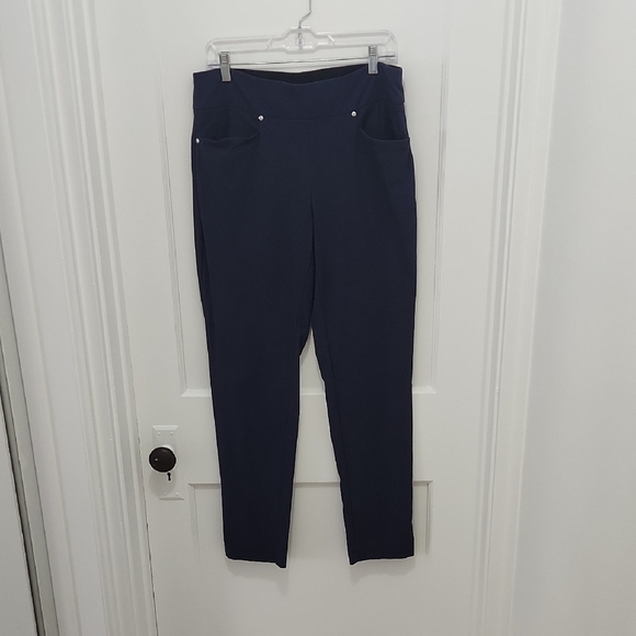 These stretchy, pull-on pants are durable and will definitely become a favorite piece in your wardrobe (and not only for golf!). Pants feature built-in tummy control for a slimming effect that smooths your figure. Other features; mid-rise cut sits just above the hips; stretch waist, vents in the hem; two side pockets and a back pocket, give you a place to put your tees/balls.
