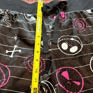 Pull On Black Velvet Style Fabric with The Nightmare Before Christmas Themed Print with Elastic Waistband Jogger and Drawstrings and Loose Fitting Leg Holes. 100% Polyester and Machine Washable! Size Small. See Measurements for Specifics on Size!
