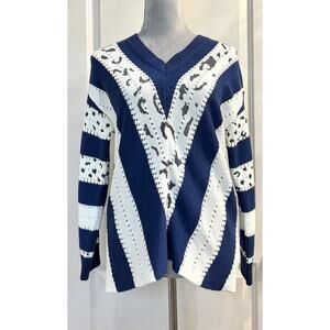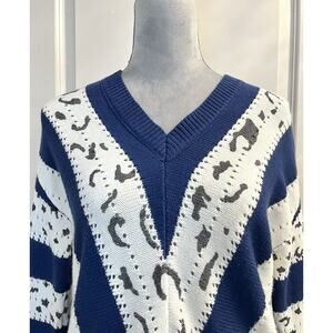 Women's Pullover Popover Chevron Sweater V Neck Leopard Print Blue Sz M