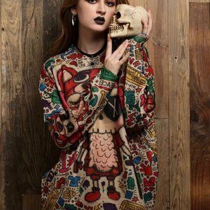Womens Pullover Sweater Small Beige Red Stretch Crew Neck Print Bear Dolls Relax