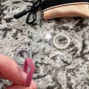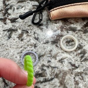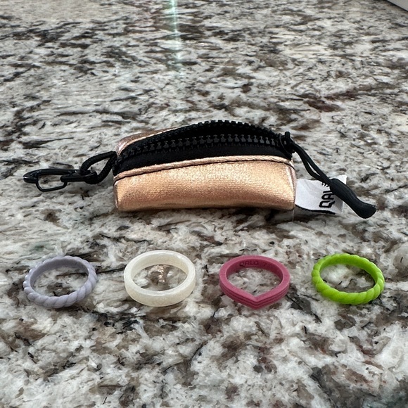 4 stackable rings. Size 7. Never worn. Comes with carrying case. Rings are stretchy material.