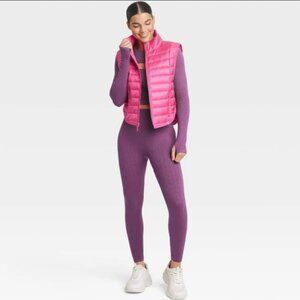 JoyLab Women's quilted puffer vest in pink, size medium. Crafted with a 100% nylon outer shell and 100% recycled polyester lining and fill, this lightweight vest is designed for layering with a relaxed fit and at-hip length. Features a sleeveless design, high stand-up collar, and full-length front zipper for easy wear. Includes functional zippered front pockets for secure storage. Machine washable and tumble dry safe for easy care