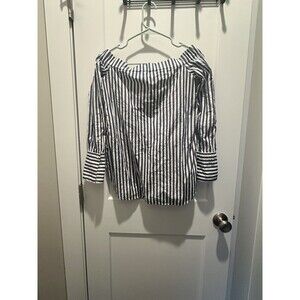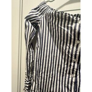This women's RAG & BONE blouse in size XS features an off-the-shoulder neckline with a stylish asymmetrical sleeve design. Made of lightweight cotton material, the striped blue and white top is accented with buttons for a chic touch. Suitable for both casual and party occasions, this USA-themed blouse has a regular fit, making it a versatile and trendy addition to your summer or spring wardrobe.