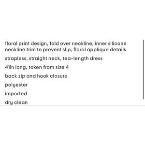 This is a strapless, tea-length dress by Rene by Rene Ruiz, featuring a vibrant floral print design on a light purple background. The dress has a straight neckline with a fold-over detail and an inner silicone trim to prevent slipping. It closes with a back zipper and hook. The material appears to be polyester, and the dress measures approximately 41 inches long, based on a size 4. The back of the dress is solid light purple with a subtle seam down the center.