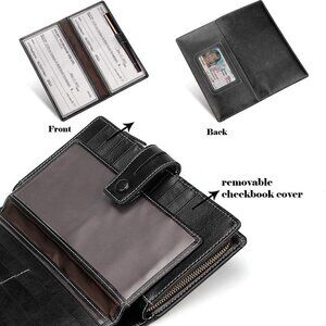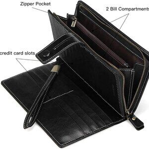 Features: Made of genuine wax-finish leather that feels luxurious and gets better with age. Bright, spacious design with 19 card slots, an ID window, passport pocket, and a removable checkbook cover with a pen holder. Plus, a zipper pocket with two bill compartments perfect for cash and coins. Convenient wristlet strap for easy carrying either in hand or on the go. RFID-blocking technology keeps your private info safe from digital theft.
