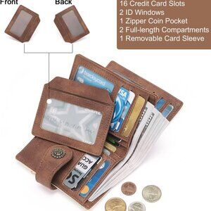Features: This trendy, high-quality vegan leather wallet has a sleek trifold design, with a snap and smooth zipper closure that keeps everything secure. It’s super functional with 16 credit card slots (including 2 ID windows), a zipper coin pocket, and full-length compartments for bills and receipts. The RFID blocking tech adds an extra layer of protection for your cards. It’s lightweight (just 4.8 ounces) and measures 3.9 x 0.5 x 4.7 inches, so it fits perfectly in your purse or pocket.