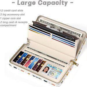 Features: This roomy wristlet wallet is perfect for carrying all your essentials. It features 12 card slots, a visual ID window, a coin pocket, plus two long cash slots and two extra-wide slots for bills, cash, and your iPhone. Made of smooth, soft PU leather with meticulous hand stitching for durability. The RFID blocking technology keeps your private info safe from unwanted scans.