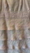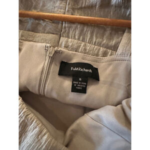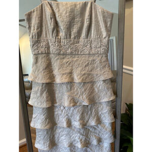 R&M Richards size 8 dress. Light beige, tiered midi dress with thin shoulder straps. Features an embroidered band at the waist. The fabric is a textured, possibly silk-like material. The dress measures approximately 36 inches in length. 17 bust Back zipper closure. Shows minor signs of wear consistent with previous use, but no significant damage or stains are visible. Made in China of imported fabric.