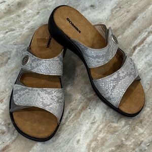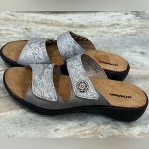 Women’s ROMIKA silver metallic leather slide sandals- Size 38. Excellent condition, like new! Little to no sign of wear. Velcro straps for adjustable fit.