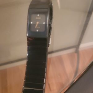 Ladies Rado watch black on black scratch-proof overall. High-tech ceramic case crown and bracelet. Sapphire crystal water resistant. Has diamonds at the 12, 3, 6 & 9. Has appraisal paper needs battery.