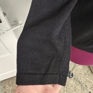 Women's Rafaella black cardigan with a beaded collar and 3/4 length sleeves. This cardigan has hidden snaps for closure. This material does stretch some.