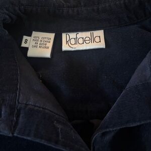 The Women's Rafaella Navy Corduroy Button Down Shirt in size 8 is a stylish and versatile addition to any wardrobe. This solid navy blue shirt features a collared neckline, long sleeves, and a button closure, making it perfect for casual occasions. Made by the trusted brand Rafaella, this regular fit shirt is machine washable for easy care and is suitable for wearing in the summer, fall, or spring seasons. With its classic design and comfortable fit, this shirt is sure to become a go-to piece for everyday wear