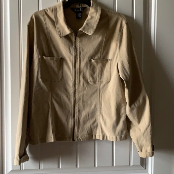 Women’s Rafaella full zip stretch top. Size 10, Color is khaki, material is 96% cotton 4% spandex, 2 front breast pockets, full front zipper, top is tapered for a more fitted fit.