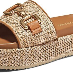 Features: These slip-on platform sandals feature a chic raffia design with a round open toe, a simple metallic chain detail, and a clear weaving texture that adds summer flair. The 2.36-inch durable rubber sole provides a stable, non-slip base, and the soft faux leather lining keeps your feet comfortable all day.