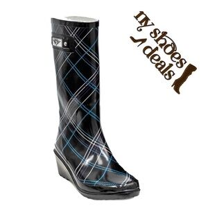 Women's Rain Boots Black Blue Plaid Wedge Rubber Rainboots