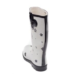 Once tried on woman rainboots by Forever Young. Gorgeous black flowers on matte white design, cotton lining, removable inner sole. Posh buckle on the calf side.