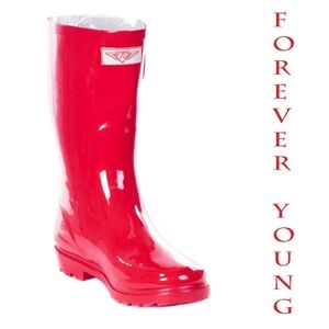 Brand new woman 100% rubber rainboots by Forever Young. Glossy outer surface is super easy to clean and maintain - just rub some olive oil in with a fiber cloth.