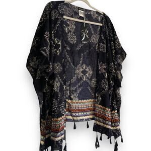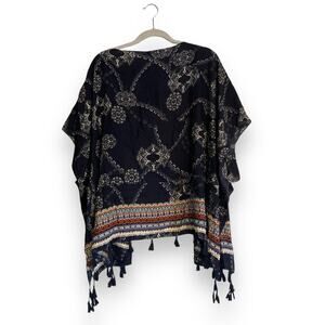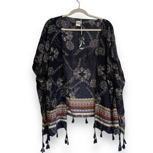 Description: Effortlessly flowing and casual boho shawl by Rampage. This new with tags, open front shawl features a rich navy blue with white geometric patterns, crisp Navajo style coloring around the hem, and a fluid, relaxed fit.
