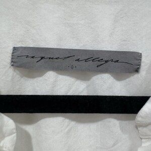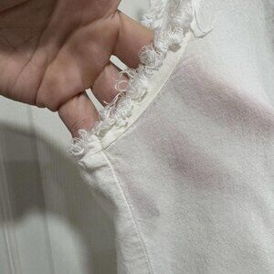 This is a women's Raquel Allegra sleeveless blouse in size 0, featuring a distressed hem design. The blouse comes in a crisp white color, making it a versatile and stylish wardrobe piece. Made by the brand Raquel Allegra, known for its unique and high-quality clothing, this top is perfect for adding a touch of edge to any outfit. Perfect for those looking for a chic and effortlessly cool addition to their wardrobe.