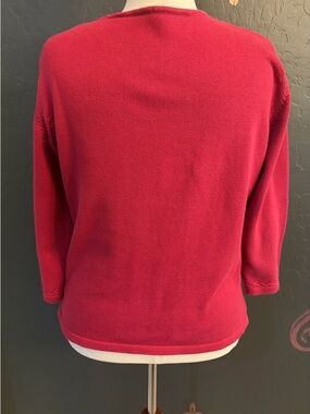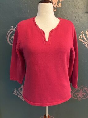 Soft raspberry knit sweater with a flattering split V neckline. Lightweight and breathable for layering or wear on its own. Three-quarter sleeves offer versatile styling. Easy-care fabric provides comfortable all-day wear.