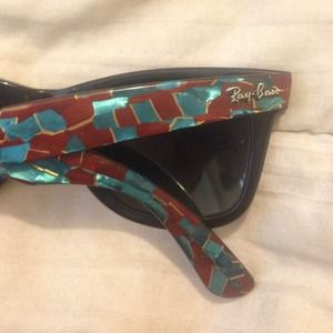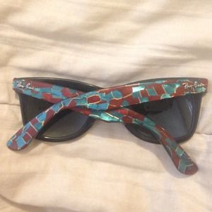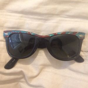 Ray Ban Wayfarers// black with blue, gold, and red accent colors. These used to be my all time favorite sunglasses but now it's time for a new favorite. Very fashionable everyday wear. Originally 195.00