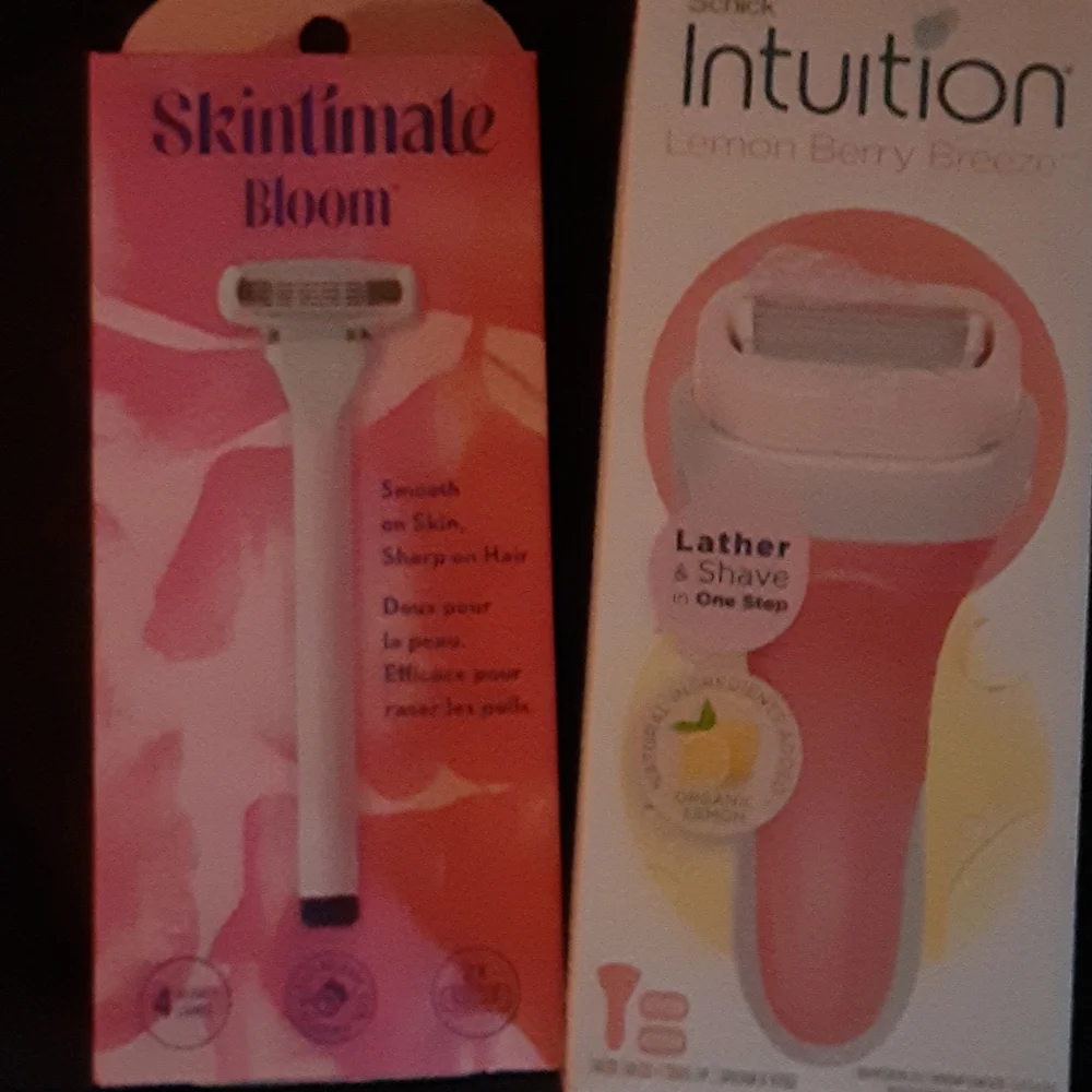 The razor bundle comes with a Schick intuition lemon berry breeze (organic lemon) razor and a Skintimate Bloom 4 blade razor. NWT in original packaging.