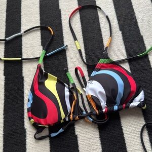 Stylish bikini set with vibrant swirl pattern. Features adjustable straps for a perfect fit.