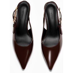 Women's Red Brown Slingback Kitten Heels Closed Pointed Toe Pumps Buckle Strap