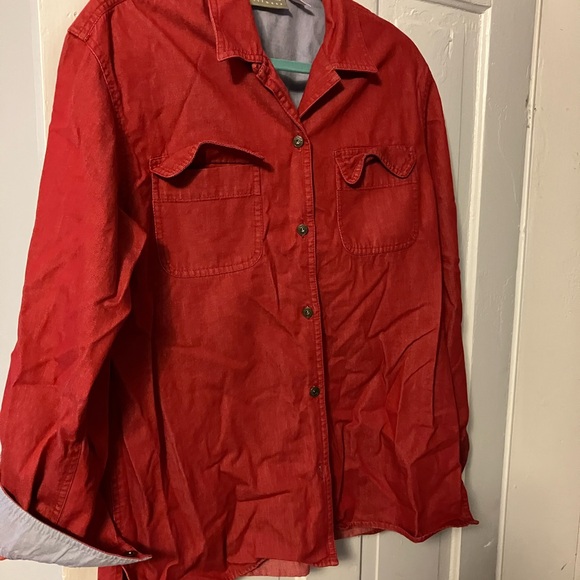 Stylish and versatile red button-up jacket for women. Perfect for layering and adding a pop of color to any outfit.
