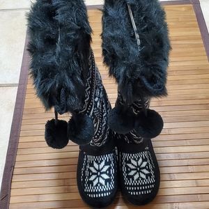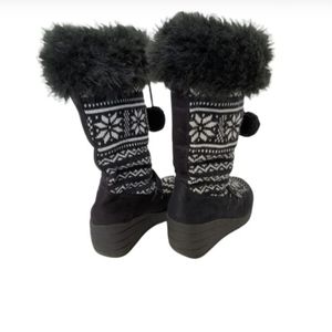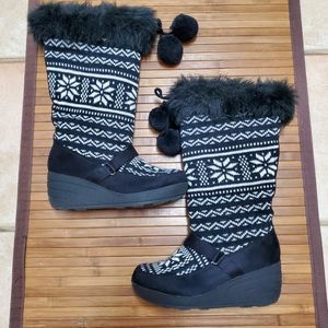 Black and white wedge knit boots with fur trim